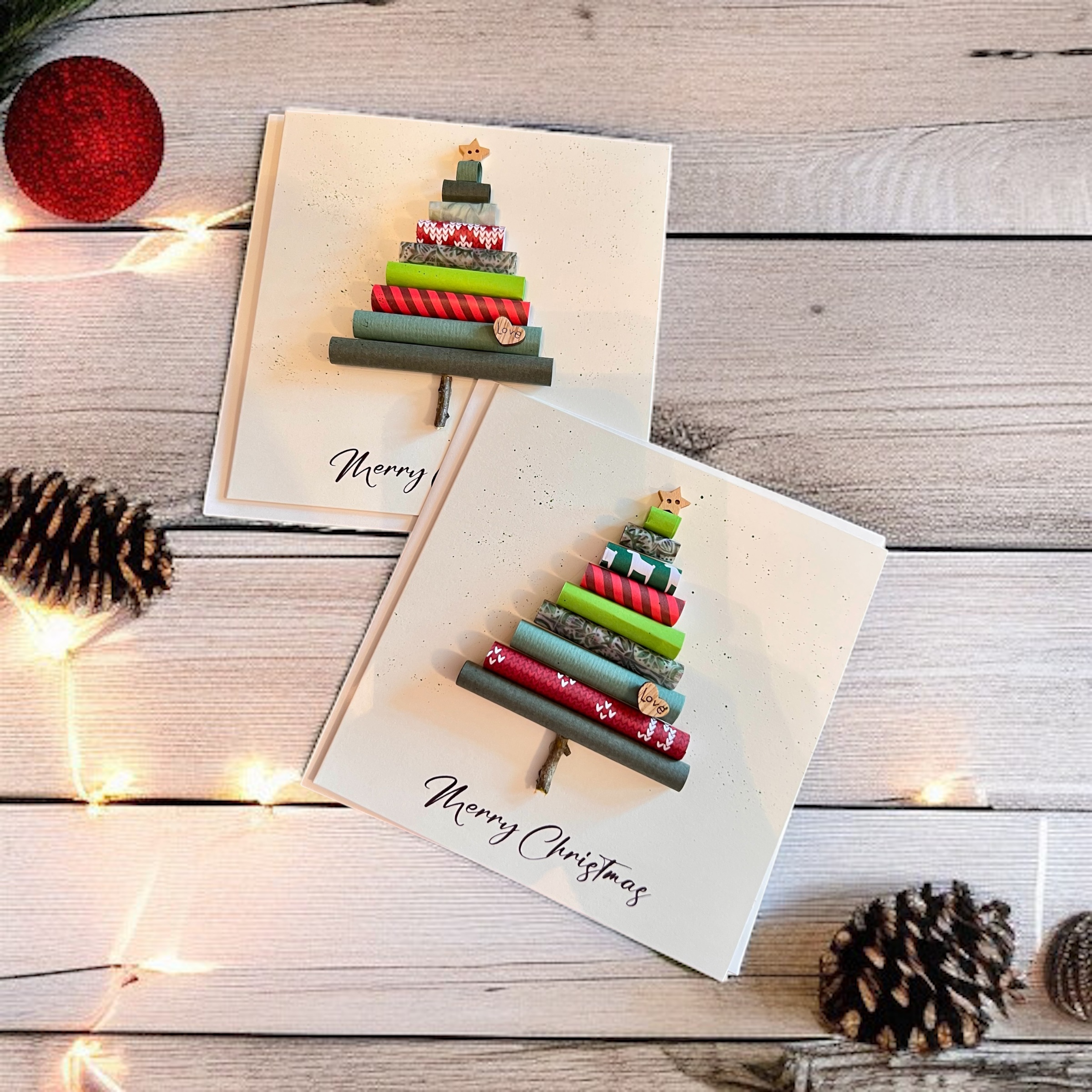 Each card features a festive layered Christmas tree design made from carefully rolled paper strips. It’s eye-catching, beautifully textured, and the perfect way to share warm wishes with someone special.