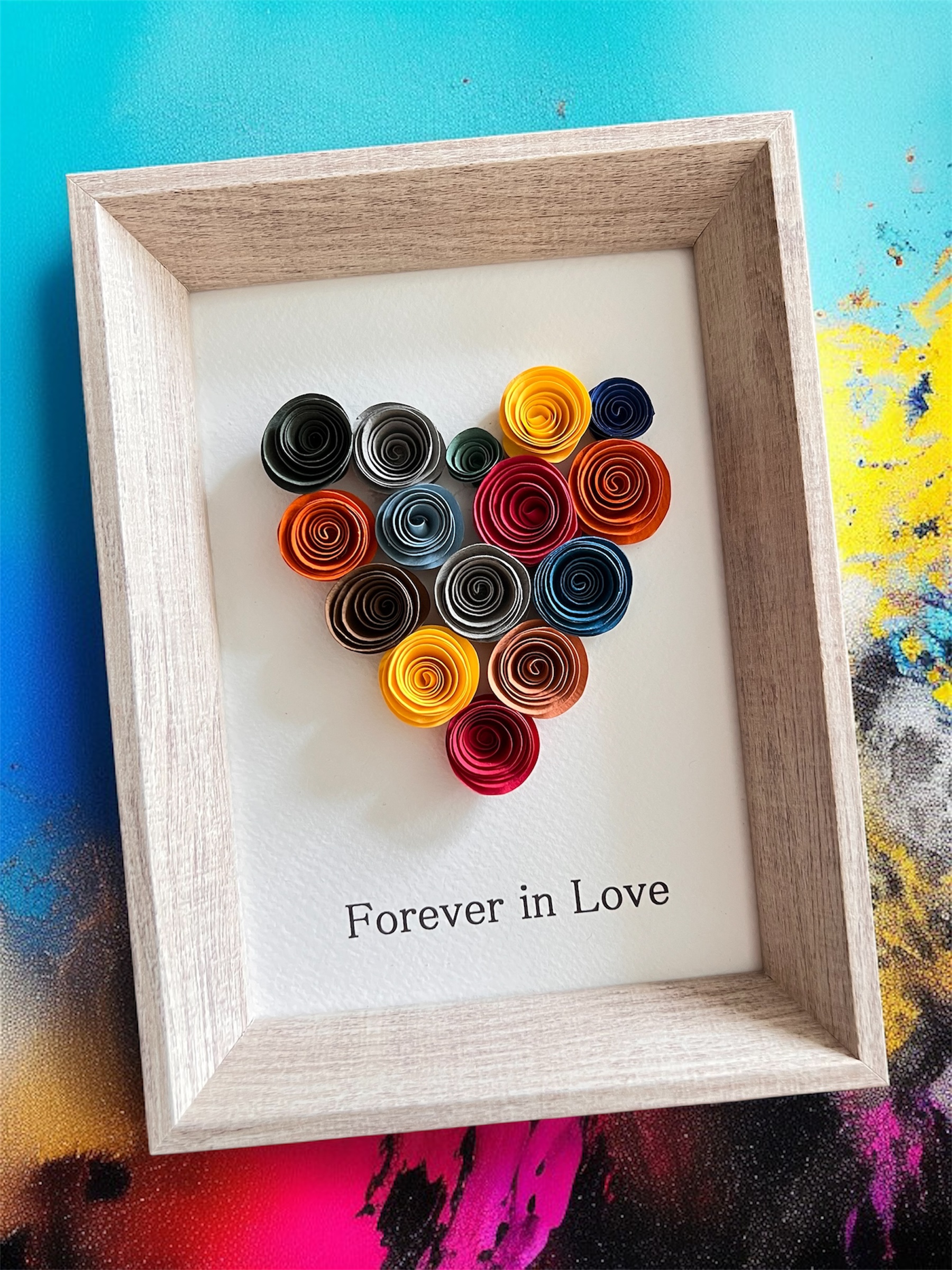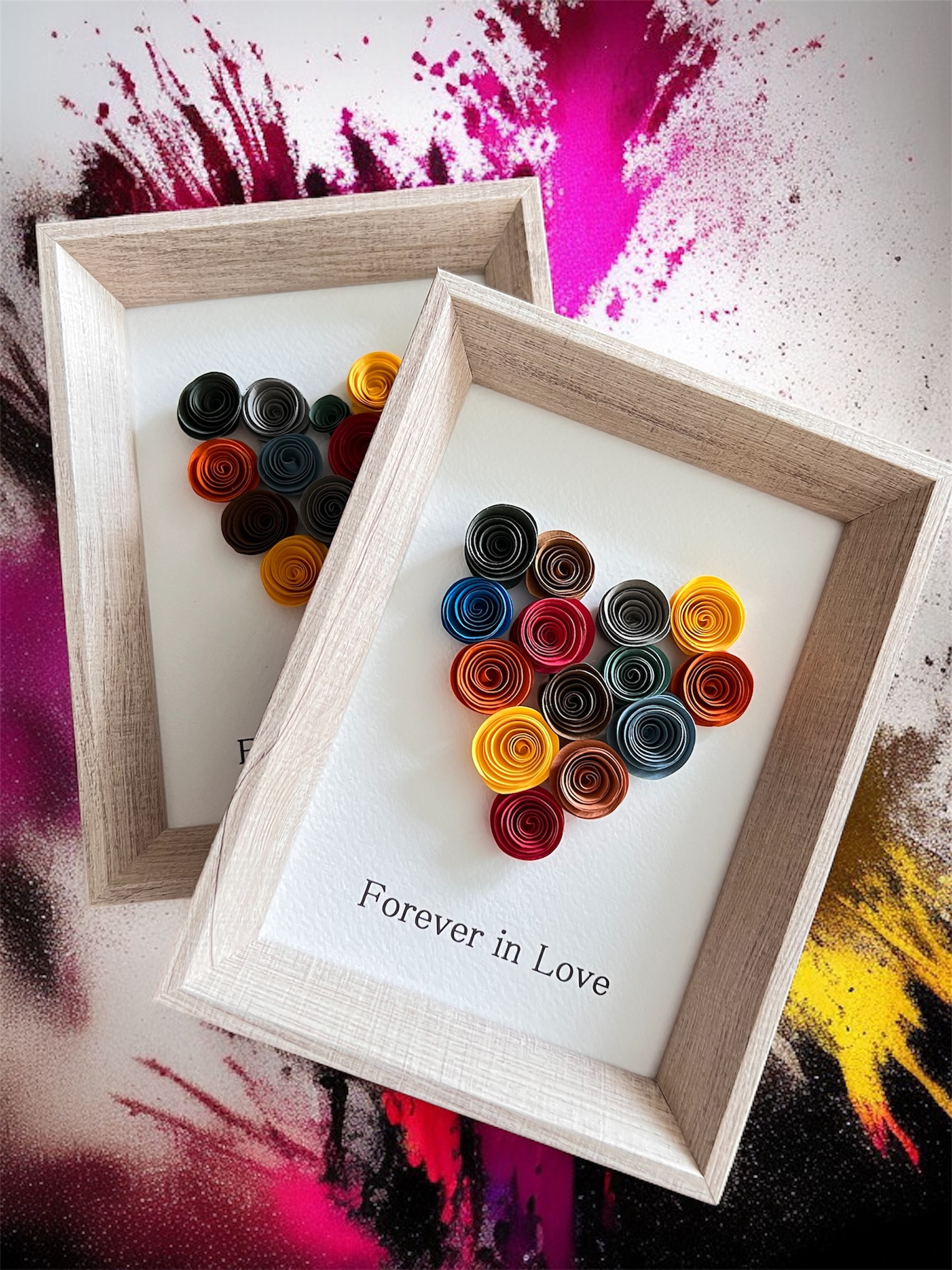 Looking for a meaningful and unique gift? This handmade framed card features a beautiful paper quilling heart with vibrant colours and the message Forever in Love.