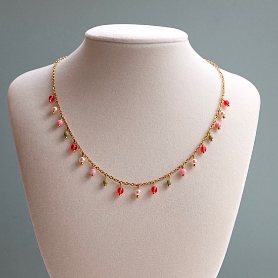 Beaded chain necklace made with glass beads and stainless steel components.