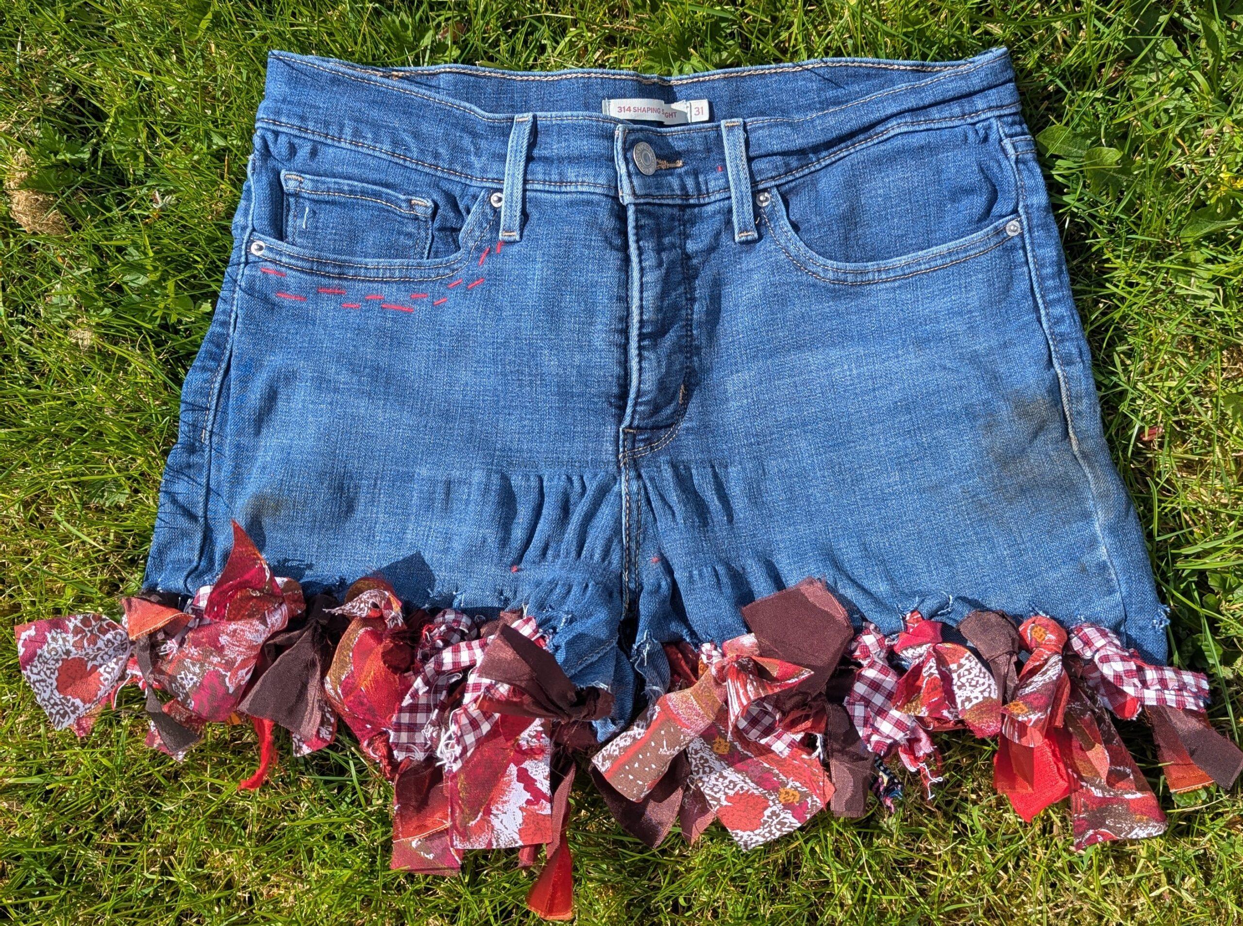 Old and worn levia jeans repurposed into hot pants.  i then use sashiko visible mending techniques and the acient art of rag rugging to create a totally uniqie new garment.