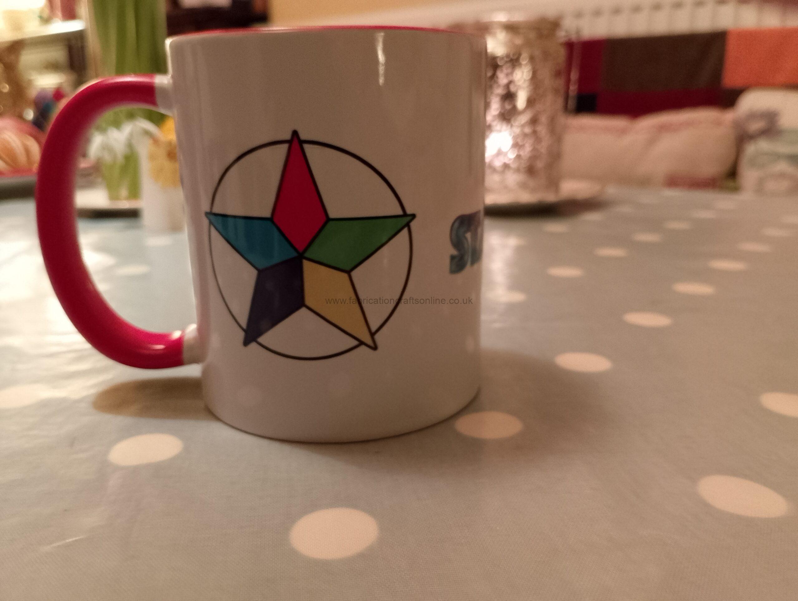 Mugs made from Printful to promote Star-Knights, and in red, blue and green.
